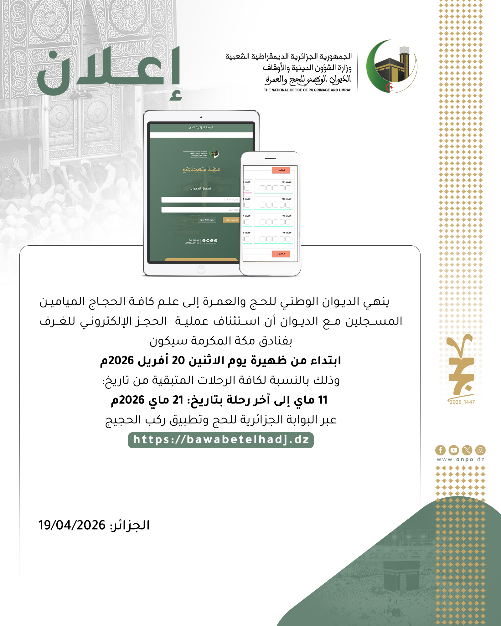 كما ذكّر البيان بأن الولوج إلى تطبيق “ركب الحجيج” يتم باستخدام نفس بيانات الدخول الخاصة بالبوابة الجزائرية للحج، داعياً المعنيين إلى متابعة الصفحات الرسمية والالتزام بالتوجيهات والتعليمات المعتمدة لتسهيل ترتيبات السفر والإقامة.