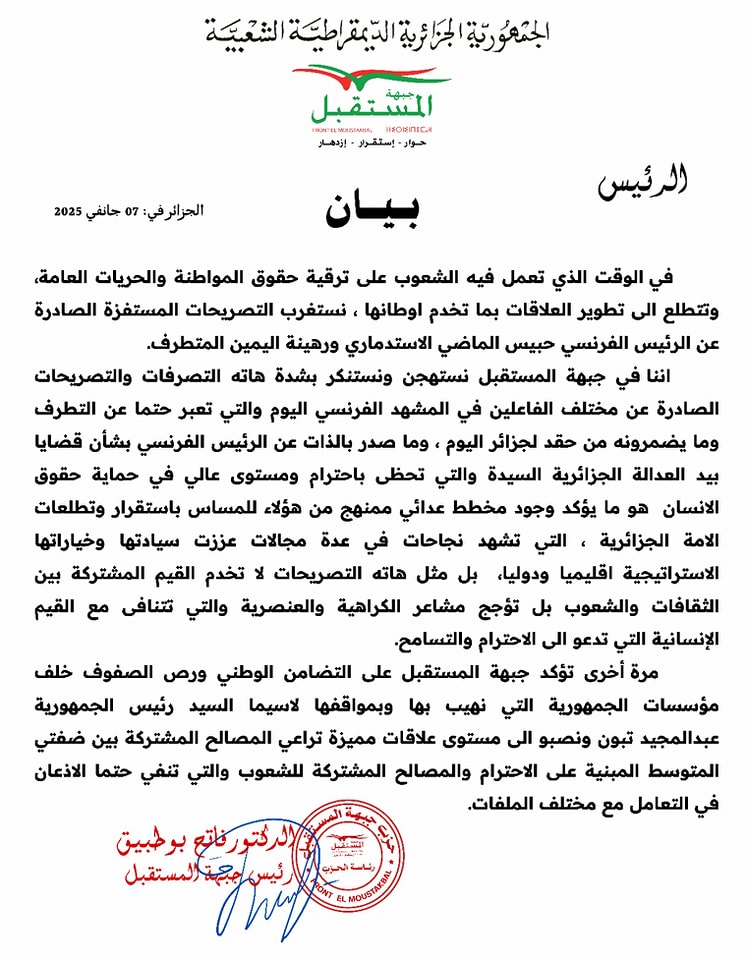 وفي ختام البيان، جدد حزب جبهة المستقبل تضامنه الوطني برص صفوفه خلف مؤسسات الجمهورية الجزائرية، مؤكدا على دعمه الكامل لمواقف الدولة، وخاصة لمواقف رئيس الجمهورية عبد المجيد تبون. وأعرب الحزب عن تطلعه إلى إقامة علاقات مميزة مع فرنسا، تقوم على الاحترام المتبادل والمصالح المشتركة بين ضفتي المتوسط.
