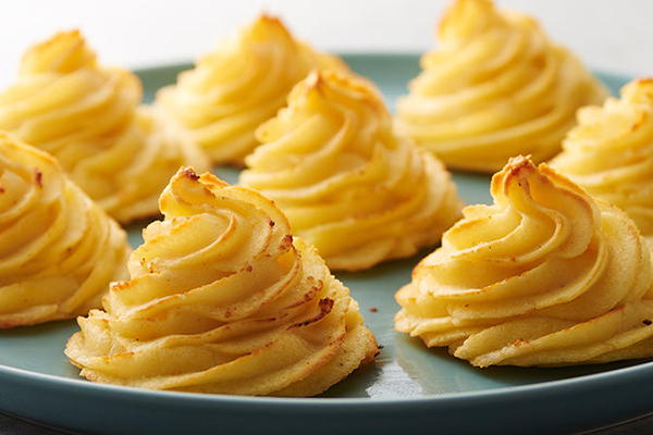 – ادهني صينية الفرن بالزبدة وبواسطة بوش آدوي شكلي وريدات من خليط البطاطا.