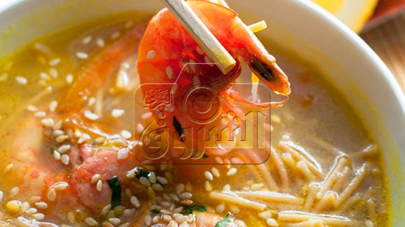 المقادير:250غ ربيان أو جمبري100غ شعرية محمصة في قليل من الزبدة من نوع ” ماريا “حبة بصل صغيرة الحجمملعقة كبيرة قصبرحبة جزر كبيرة الحجمملعقة صغيرة زنجبيل مبشور20 غ شعيرية الأرزنصف ملعقة صغيرة كركم02 ملاعق كبيرة صوص صويا ملح / فلفل أسود02 ملاعق كبيرة زيت الزيتونملعقة كبيرة جلجلان