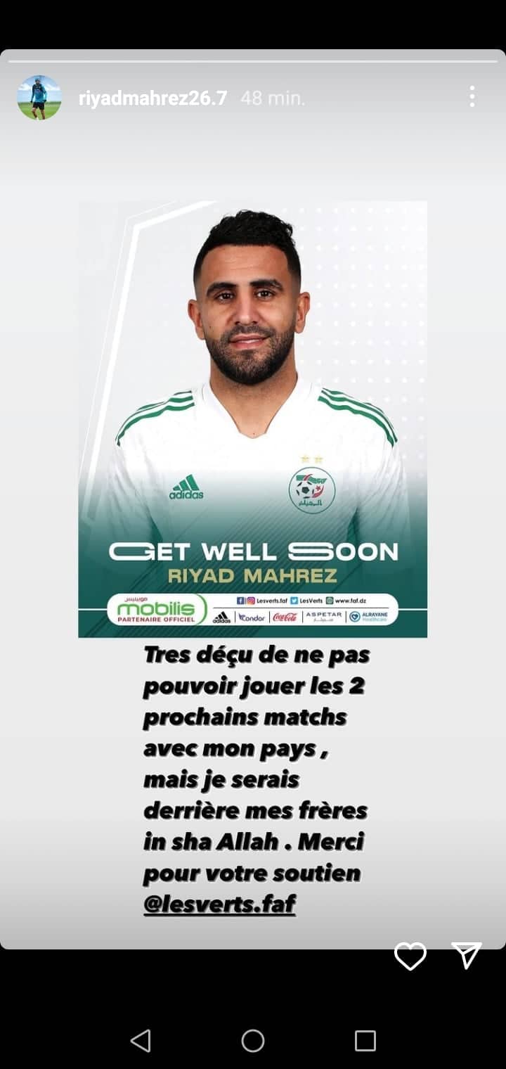 وقال محرز في المنشور: “حزين جداً لعدم مشاركتي في المباراتين القادمتين لمنتخب بلادي، لكني سأكون خلف إخواني ورفاقي إن شاء الله، شكرا على دعمكم”.