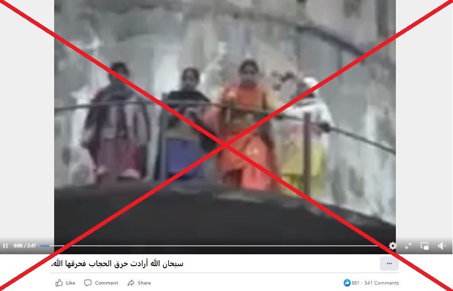 يظهر في الفيديو أربعة نساء واقفات على ما يبدو أنه برج، قبل أن تشتعل النار وسط صراخ حشد من الناس، وجاء في التعليق المرافق: “حاولت أن تحرق الحجاب فحرقها الله”.