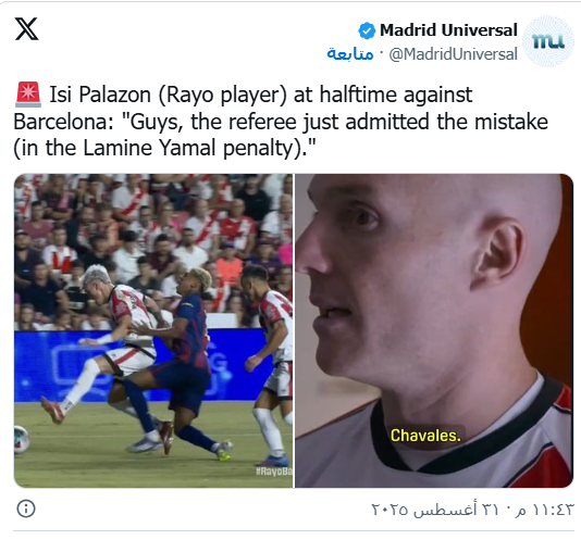 ونشرت صحيفة “ماركا” الإسبانية، الأحد، تصريحات إيسي بالازون التي التقطتها العدسات أثناء حديثه مع زملائه في طريقهم إلى غرف تبديل الملابس، فقال: “يا شباب، لقد اعترف الحكم بخطئه”.