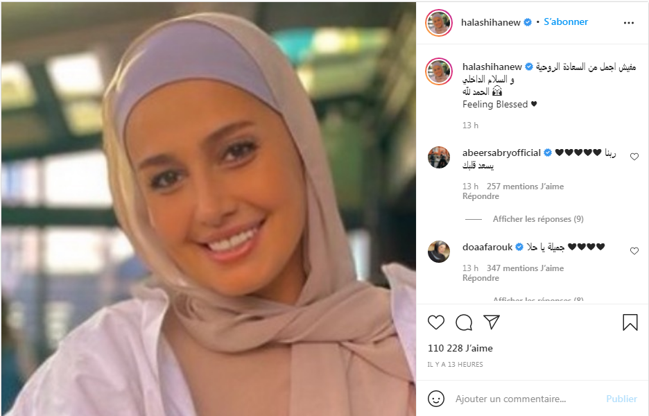 ونشرت الفنانة أحدث صورة لها بالحجاب الكامل، وعلقت بالقول: “مفيش أجمل من السعادة الروحية والسلام الداخلي.. الحمد لله”.