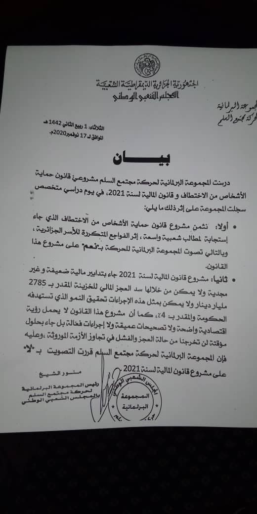 قررت المجموعة البرلمانية لحركة مجتمع السلم، التصويت بـ”لا” على مشروع قانون المالية لسنة 2021.