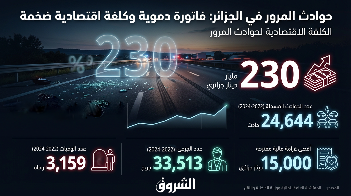 قدّرت المفتشية العامة للمالية الكلفة الاقتصادية لحوادث المرور في الجزائر بنحو 230 مليار دينار، في حصيلة تعكس خطورة الوضع وتدعم التوجه نحو تشديد مُمنهج للعقوبات ضمن مشروع قانون المرور الجديد المعروض حاليًا للدراسة على مستوى المجلس الشعبي الوطني.