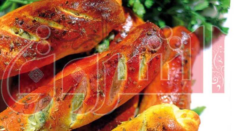 من جهة أخرى، امزجي الجبن مع البقدونس و تبلي بالثوم و الفلفل الأسود مع ملعقتين زيت الزيتون، ثم ضعيه و ابسطيه على العجينة،  ولفيها على شكل خبرة طويلة، ادهنيها بصفار البيض الممزوج بالحليب و رشيها بحب الكمون من فوق.