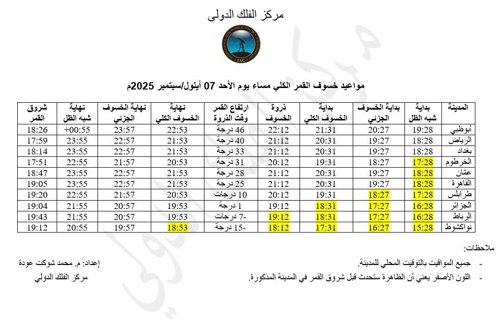 وبالنسبة للجزائر، يُنتظر أن يبدأ القمر بالدخول في منطقة شبه الظل عند الساعة 18:28 بالتوقيت المحلي، ثم يبدأ الخسوف الجزئي في 19:27، بينما يبدأ الخسوف الكلي عند 18:31، ليصل إلى ذروته في 19:12. وسينتهي الخسوف الكلي في 19:53، ثم ينتهي الخسوف الجزئي عند 20:57، على أن يخرج القمر نهائيا من منطقة شبه الظل بحلول 21:55 ليعود إلى وضعه الطبيعي.