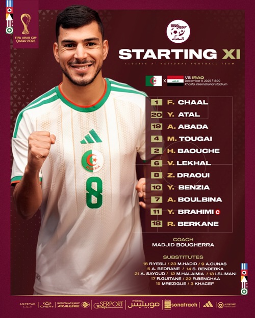 كشف الناخب الوطني الجزائري مجيد بوقرة مساء الثلاثاء، عن تشكيلة الفريق المحلي في مواجهة العراق.