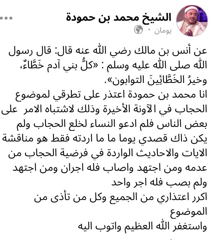 وتابع: “أنا محمد بن حمودة اعتذر عن تطرقي الى موضوع الحجاب في الآونة الأخيرة وذلك لاشتباه الأمر على بعض الناس فلم أدعُ النساء الى خلع الحجاب ولم يكن ذاك قصدي يوماً ما”.