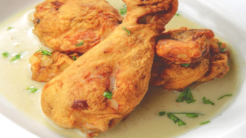 في وعاء نخفق البيض ثم نضيف النشاء والفرينة ونخلط جيدا، ثم نضيف الماء تدريجيا حتى نتحصل على خليط متماسك نوعا ماء،ثم نضيف له الخل والملح والفلفل الأسود،ثم نغمس قطع الدجاج في الخليط ثم نقليها في الزيت الساخن حتى تأخذ اللون الذهبي، ثم نضعها في صينية فرن ونغطيها بورق الألمنيوم وندخلها الفرن كي تنضج.