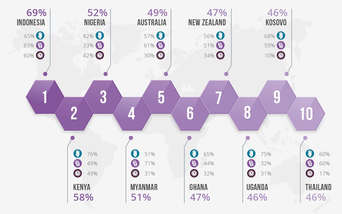 في ذات السياق احتلت إندونيسيا المرتبة الأولى في مؤشر العطاء بنسبة بلغت %69. وفقًا للتقرير، هنالك أكثر من 8 من كل 10 إندونيسيين تبرعوا بالمال في عام 2020، حيث تعد معدلات التبرع فيها مرتفعة فوق المتوسط.