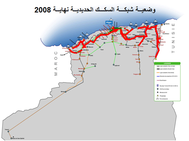 هــــام: يشمل طول السكة في نهاية 2020 (5941 كلم) خطي “توفرت – حاسي مسعود” و “البيض-ا لمشرية” نظرا لتقدم أشغالهما ويستبعد، على عكس ذلك، خط “تلمسان- لحدود الغربية” بسبب تأخر انطلاق أشغاله أثناء السعي لاعتماد مكتب متابعة الأشغال، كما يستبعد خط “غليزان – تيارت” بسبب تباطؤ أشغـاله في علاقة مع تعويض أحد المتعاقدين الأجانب المنسحب من العــقـد. ويستبعد، أيضا، الخط المعدني الشرقي الثاني”عنابة – جبـل العنـق” بسبب التأخر المسجل في الانطلاق الميداني للأشغال لاعتبارات مختـلــفة لها علاقة بالتصويبات ذات الصلة بمسار الخط وبنقص الاعتمادات المالية. كما يستبعد، من جهة أخرى، خط “حاسي مفسوخ بولاية وهران – مستغانم” الذي أعلن عن انطلاق أشغاله، رسميا، في جوان 2013 والموكل إنجازه لمؤسسة عمومية متخصصة مع توفر التمويل الضروري آنذاك، لأسباب لها علاقة بنـزع ملكية الأراضي الفلاحية. ويستبعـد، موضوعـيا، خط “بني منصور- بجاية” بسبب المماطلات الطويلة بشأن نـزع ملكية الأراضي رغم التعاقد بشأن إنجازه الذي تـم قبل أكثر من خمس سنوات، بالإضافة إلى أن المشروع هو تحديث وعصرنة وكهربة لخـط قائم ومستغل حاليا. ويستبعـد، أخيرا، خـط “بوغزول (و.المــدية) – العفرون” الذي لم يتـم التعاقـد بشأنه بعـد، بسبب شــح الاعتمادات المالية : إن مجموع هذه الحيثيــات يعـــلل، إجمالا، الفــارق مع 6300 كيلومتر المنتظرة لنهاية سنة 2020 والتي كانت، في الأصل، منتظرة في سنة 2016/2017، بسبــب تتـراجـع المـوارد الماليـة المتأتية من البترول.