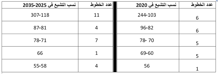 ويتوقع ان تتراوح درجة التشبع في سنة 2020، بين 244 و 55 % لتصل في الفترة 2025-2035 إلى نسب تتراوح بين 307 و 56 % بالنسبة ل 26 خطا التي تكو، حينها، مستغلة، كما هو موضح فيما يلي: