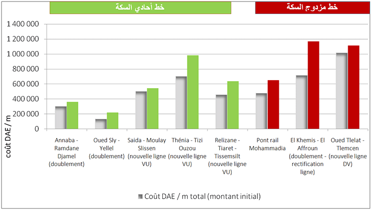 . 2,23 مليون دج/كلم (20,0 مليون أورو/كلم) بالنسبة للخط أحادي السكة
