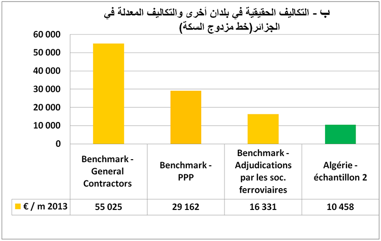 ويمكن استكال هذه المقارنة بمقارنة التكاليف في الجزائر بالتكاليف في بلدان أخرى: تكاليف حقيقية وتكاليف معدلة وتكاليف تعاقدية لخطوط أحادية ومزدوجة السكة كما يوضحه التمثيلان البيانياـن التاليـان: (ب( و(ج) الواردان في الصفحة 13 أدناه: