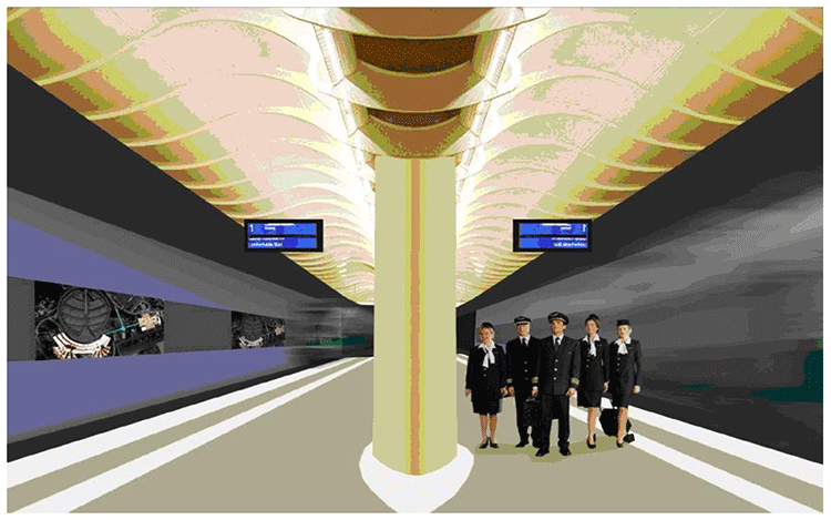 (2) الطابق السفلي: رصيف وصول وانطلاق القطار على عمق (,52 ,9 أمتار) تحت سطح الأرض