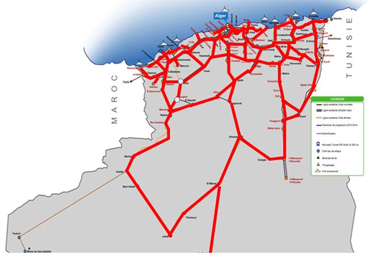 وتبعا لذلك، وبصفة آلية على ما يبدو، يتزحزح البرنامج التوسعي والتحديثي الذي كان مبرمجا لآفاق 2025، للمرحلة اللاحقة (2025-2035). ويشتمل هذا البرنامج على أهداف عملاقة يتم بموجبها تمديد شبكة السكة الحديدية إلى الجنوب الكبير الذي يرمي بالأساس، إلى ربط تندوف وتمنراست وإيليزي بشبكة السكة الحديدية الوطنية.