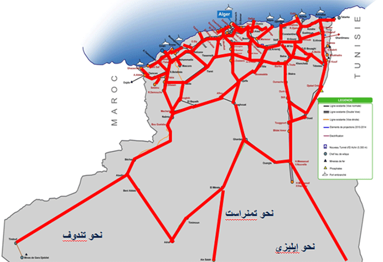 ويخطط، تبعا لهذه الرؤية، أن تكون شبكة السكة الحديدية في آفاق 2035 حسب ما توضحه الخريطة التالية، وصولا إلى تندوف وتمنراست وإيليزي: