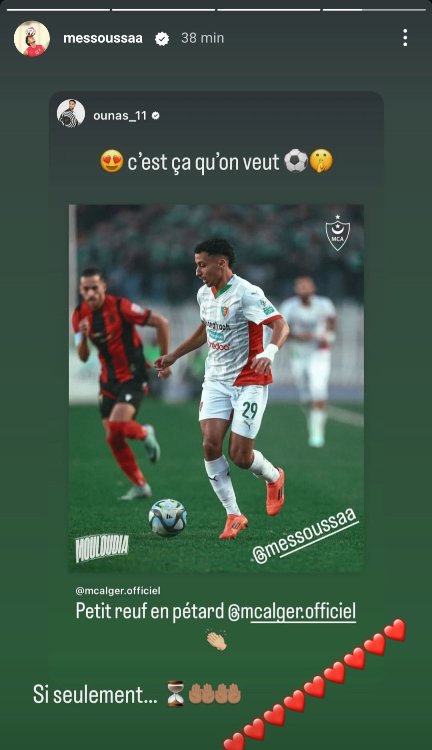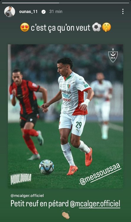 وقال صانع الألعاب آدم الوناس في أحد المنشورَين عبر منصّة التواصل الاجتماعي “إنستغرام”: “هذا الذي نريده”، وأرفقه بِصورة للاعب أمين مسوسة مهاجم مولودية الجزائر في مواجهة الغريم التقليدي اتحاد العاصمة.