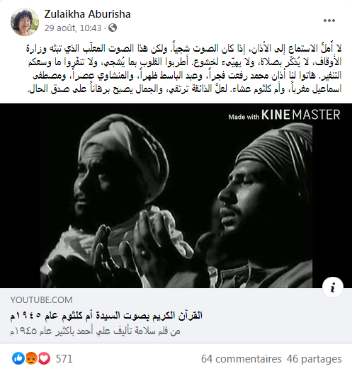 وأضافت: “أطربوا القلوب بما يُشجي، ولا تنفّروا ما وسعكم التنفير. هاتوا لنا أذان محمد رفعت فجراً، وعبد الباسط ظهراً، والمنشاوي عصراً، ومصطفى اسماعيل مغرباً، وأم كلثوم عشاء. لعلَّ الذائقة ترتقي، والجمال يصبح برهاناً على صدق الحال”.