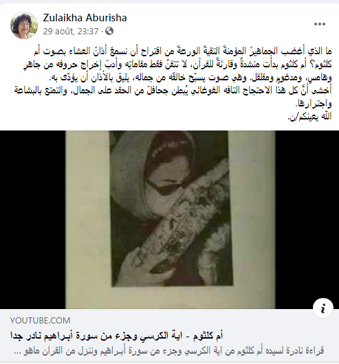 وأثارت التدوينة سخط متابعي الكاتبة الذين هاجموها من خلال التعليقات، وطالبوها بعدم الاستهزاء بالدين لأن صوت المرأة عورة، وأم كلثوم مغنية وليست مؤذنة، لترد عليهم: “ما الذي أغضب الجماهيرَ المؤمنةَ التقيةَ الورعةَ من اقتراح أن نسمعَ أذانَ العشاء بصوت أم كلثوم؟ أم كلثوم بدأت منشدةً وقارئةً للقرآن، لا تتقنُ فقط مقاماتِه وأدبَ إخراج حروفه من جاهرٍ وهامسٍ، ومدغومٍ ومقلقل. وهي صوت يسبّح خالقَه من جماله، يليق بالأذان أن يؤدّى به”.