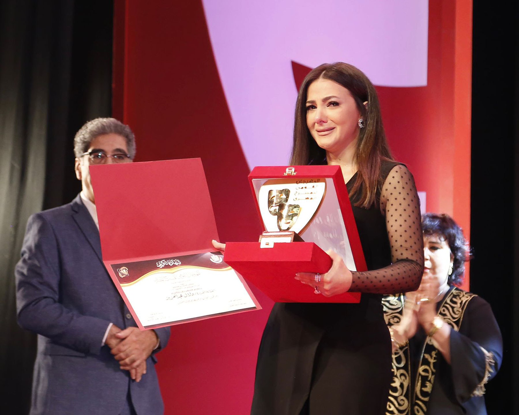 كما دخلت في نوبة بكاء مطولة، قبل أن تبكي مجدداً على المسرح بعد تسلمها التكريم. وقالت كلمات مقتضبة للغاية غلبت عليها دموعها.