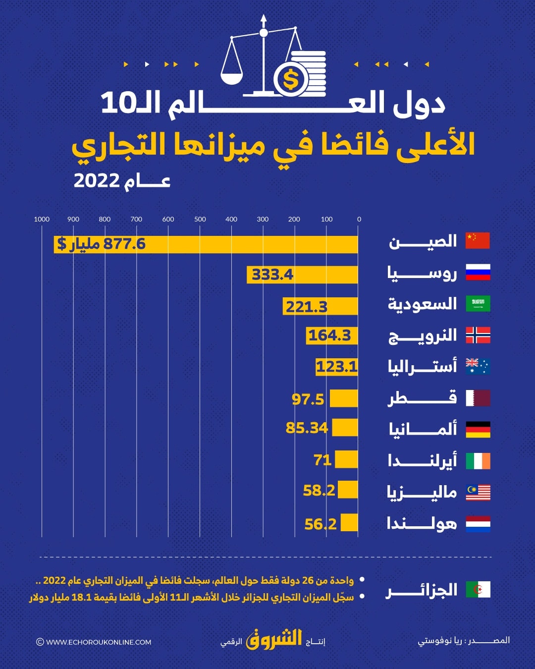 هذه هي الدول العشرة الأعلى فائضا في ميزانها التجاري عام 2022..