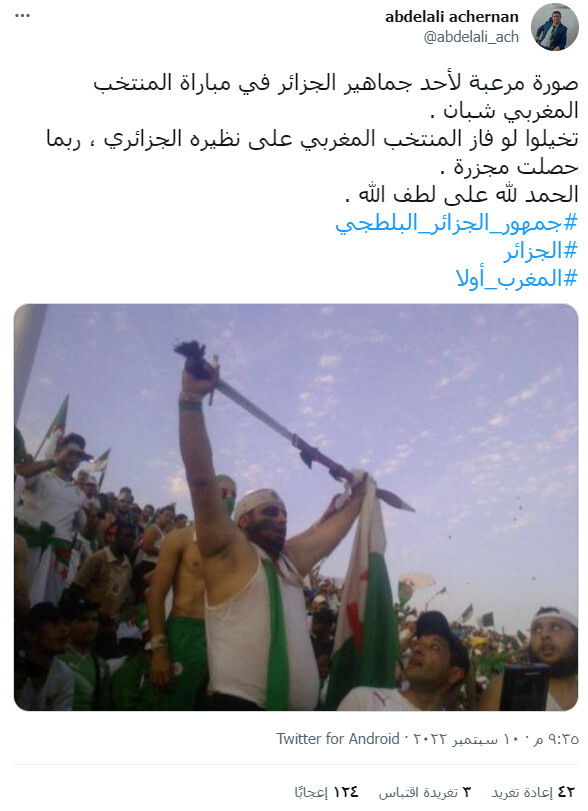مباشرة بعد فوز لاعبي المنتخب الجزائري لكرة القدم لأقل من 17 سنة، في نهائي كأس العرب، على حساب المنتخب المغربي، شرع ذباب المخزن في تداول صورة يدّعون أنها لمشجّع جزائري يحمل سيفا في مدرجات الملعب الذي احتضن اللقاء.