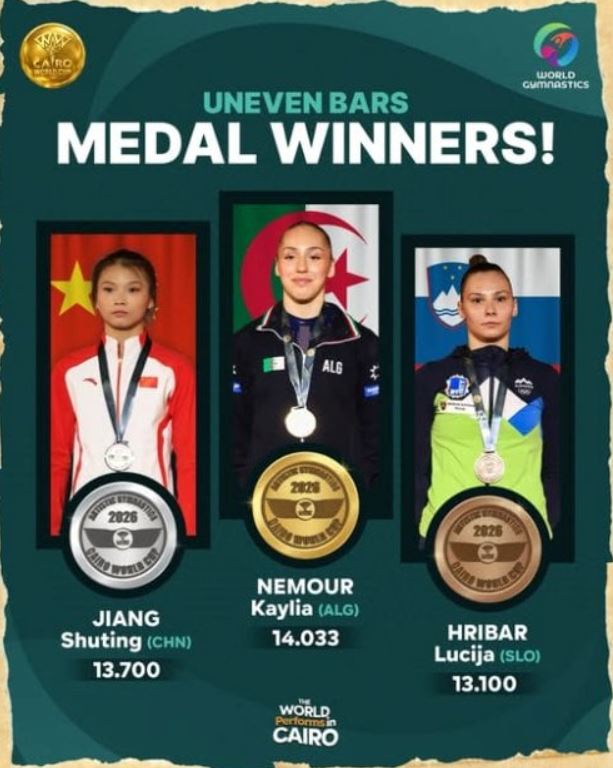 أهدت البطلة كيليا نمور الجزائر مساء الأحد مرّة أُخرى ميدالية ذهبية، في جولة كأس العالم للجمباز بِالعاصمة المصرية القاهرة.