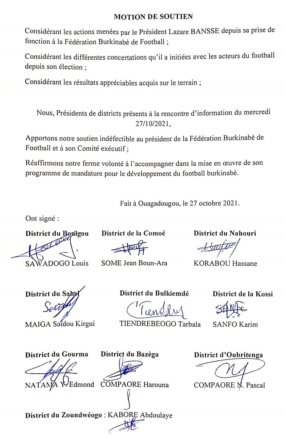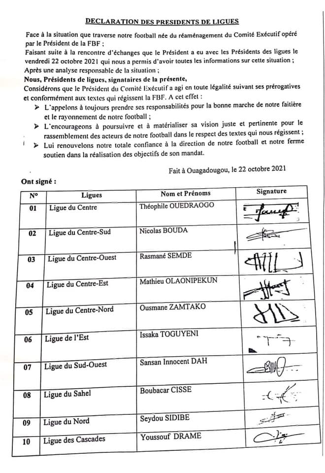 ونشر اتحاد الكرة البوركينابي، الجمعة، بيانا يكشف فيه عن تلقّي الرئيس لازار بانسي دعم زملائه الذين يُشرفون على تسيير الرابطات الجهوية.
