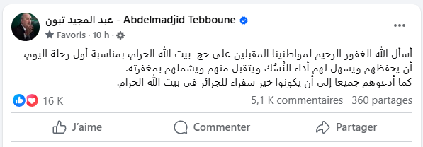 وفي منشور له على حسابه الرسمي عبر مواقع التواصل الاجتماعي، قال الرئيس تبون: “أسأل الله الغفور الرحيم لمواطنينا المقبلين على حج بيت الله الحرام، بمناسبة أول رحلة اليوم، أن يحفظهم ويسهل لهم أداء النسك ويتقبل منهم ويشملهم بمغفرته”.