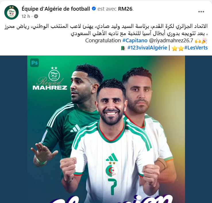 وجاء في رسالة التهنئة: “الاتحاد الجزائري لكرة القدم، برئاسة وليد صادي، يهنئ لاعب المنتخب الوطني، رياض محرز، بعد تتويجه بدوري أبطال آسيا للنخبة مع ناديه الأهلي السعودي.”