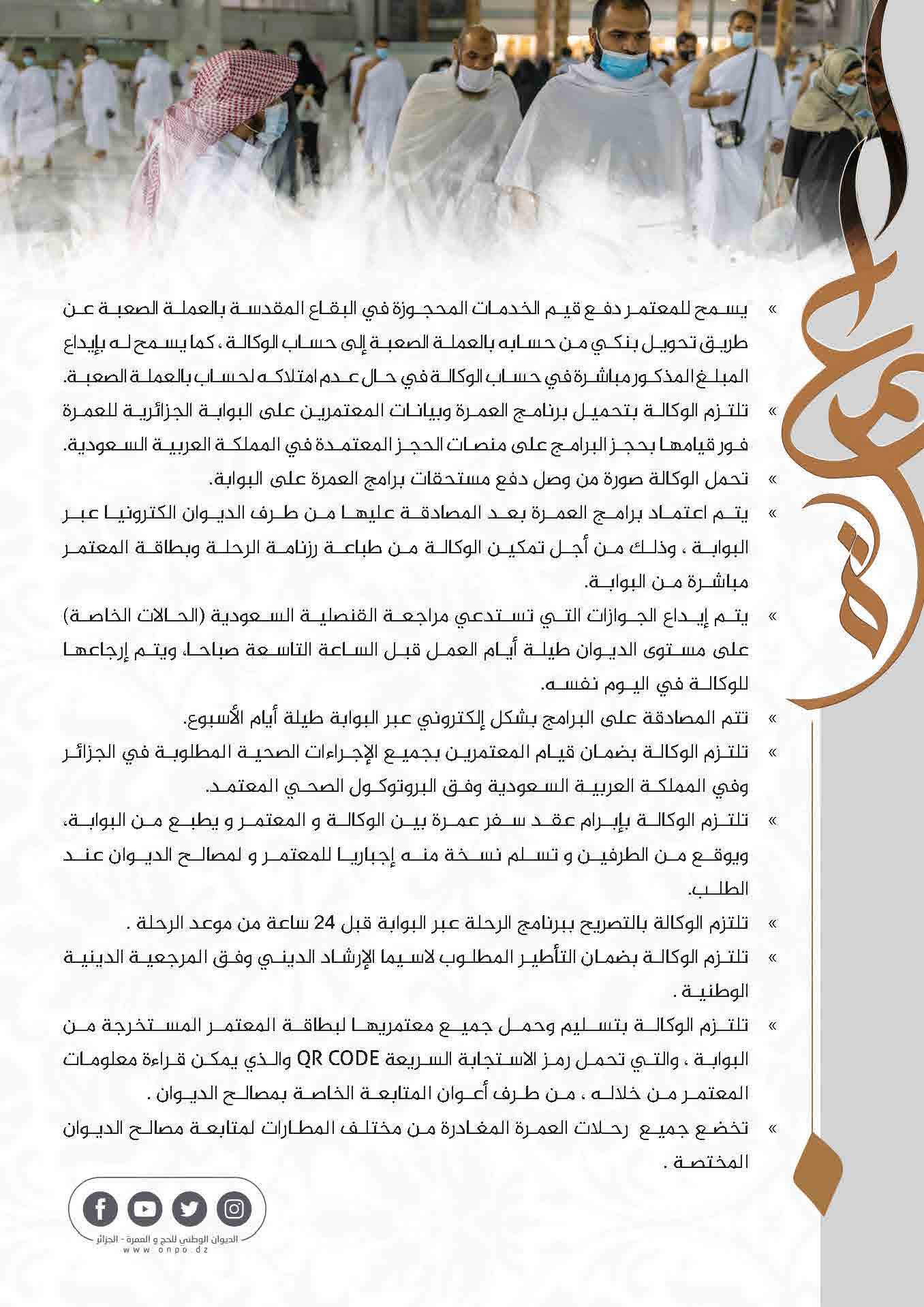 ودعا الديوان كافّة الوكالات السياحية المرخّص لها بتنظيم رحلات العمرة، إلى “الالتزام الصارم ببنود دفتر الشروط. ضمانا لحسن التكفّل بالمعتمرين الجزائريين”.