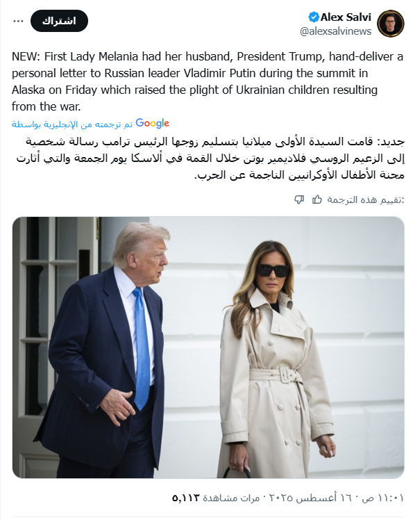 وصرح مسؤولان في البيت الأبيض لرويترز بأن ميلانيا ترامب، المولودة في سلوفينيا، كتبت رسالة إلى بوتين ذكرت فيها اختطاف الأطفال في الحرب التي استمرت أكثر من ثلاث سنوات، وقد سلمها ترامب لبوتين خلال القمة.