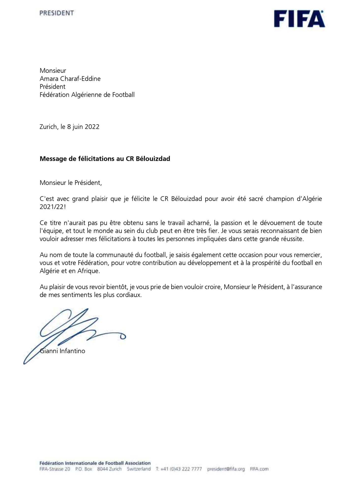 وذيّل جياني أنفونتينو رسالته مُخاطبا شرف الدين عمارة رئيس “الفاف”، بِالعبارة التالية: “آمل أن ألتقي بكم مرّة أخرى في أقرب وقت. وأرجو أن تقبل منّي سيّدي الرّئيس، أصدق المشاعر”.