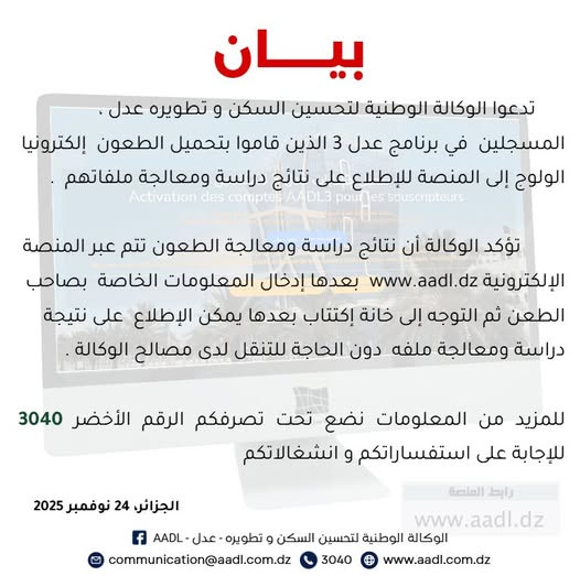 ودعت الوكالة الوطنية لتحسين السكن و تطويره عدل، المسجلين  في برنامج عدل 3 الذين قاموا بتحميل الطعون  إلكترونيا الولوج إلى المنصة للاطلاع على نتائج دراسة ومعالجة ملفاتهم  .
