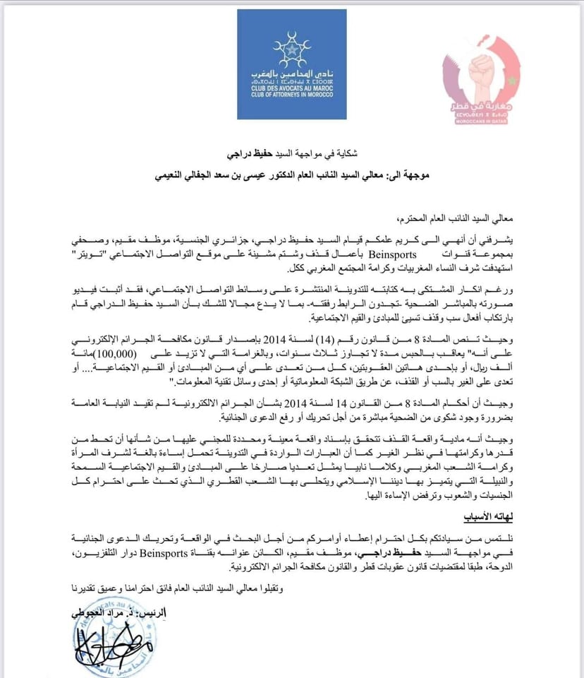 وجاء في مستهل الشكوى: ”يشرفني أن أنهي إلى كريم علمكم قيام حفيظ دراجي جزائري الجنسية، موظف مقـيم، وصحفي بمجموعـة قنوات Beinsports بأعمال قذف وشتم مشينة علـى موقع التواصل الاجتماعي “تويتر” استهدفت شرف النساء المغربيات وكرامة المجتمع المغربي ككل”.