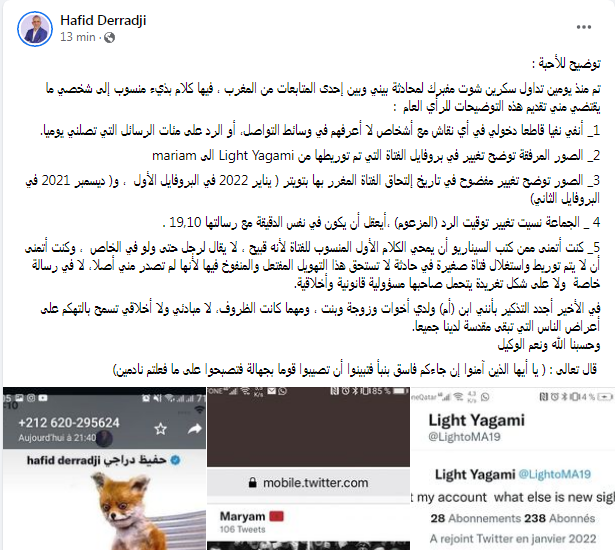 ولجميع الإخوة المتابعين الذين انتصروا للحق وفضحوا فبركة الرسائل الوهمية بمراسلتهم إدارة تويتر أقول لهم من أعماق القلب شكرا— hafid derradji حفيظ دراجي (@derradjihafid) January 21, 2022
