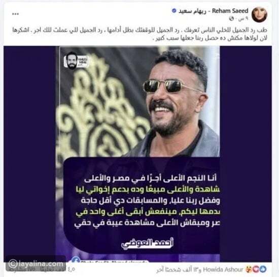 ووجهت ريهام سعيد رسالة مباشرة إلى الفنان عبر حسابها على فيسبوك قائلة: طب رد الجميل للي خلى الناس تعرفك، رد الجميل للي وقفتك بطل قدامها، رد الجميل للي عملت لك أجر، اشكرها لأن لولاها ما كانش ده حصل، ربنا جعلها سبب كبير.