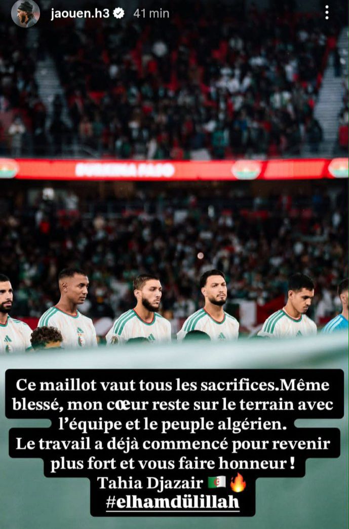 ونشر لاعب المنتخب الوطني، جوان حجام، رسالة مؤثرة عبر خاصية “الستوري” على حسابه الرسمي بموقع “إنستغرام”، عبّر فيها عن تمسكه بقميص المنتخب الوطني رغم الإصابة، قائلاً: “هذا القميص يستحق كل التضحيات. حتى وأنا مصاب، قلبي يبقى على أرض الملعب مع الفريق والشعب الجزائري. لقد بدأ العمل بالفعل من أجل العودة أقوى وتشريفكم! تحيا الجزائر الحمد لله”.