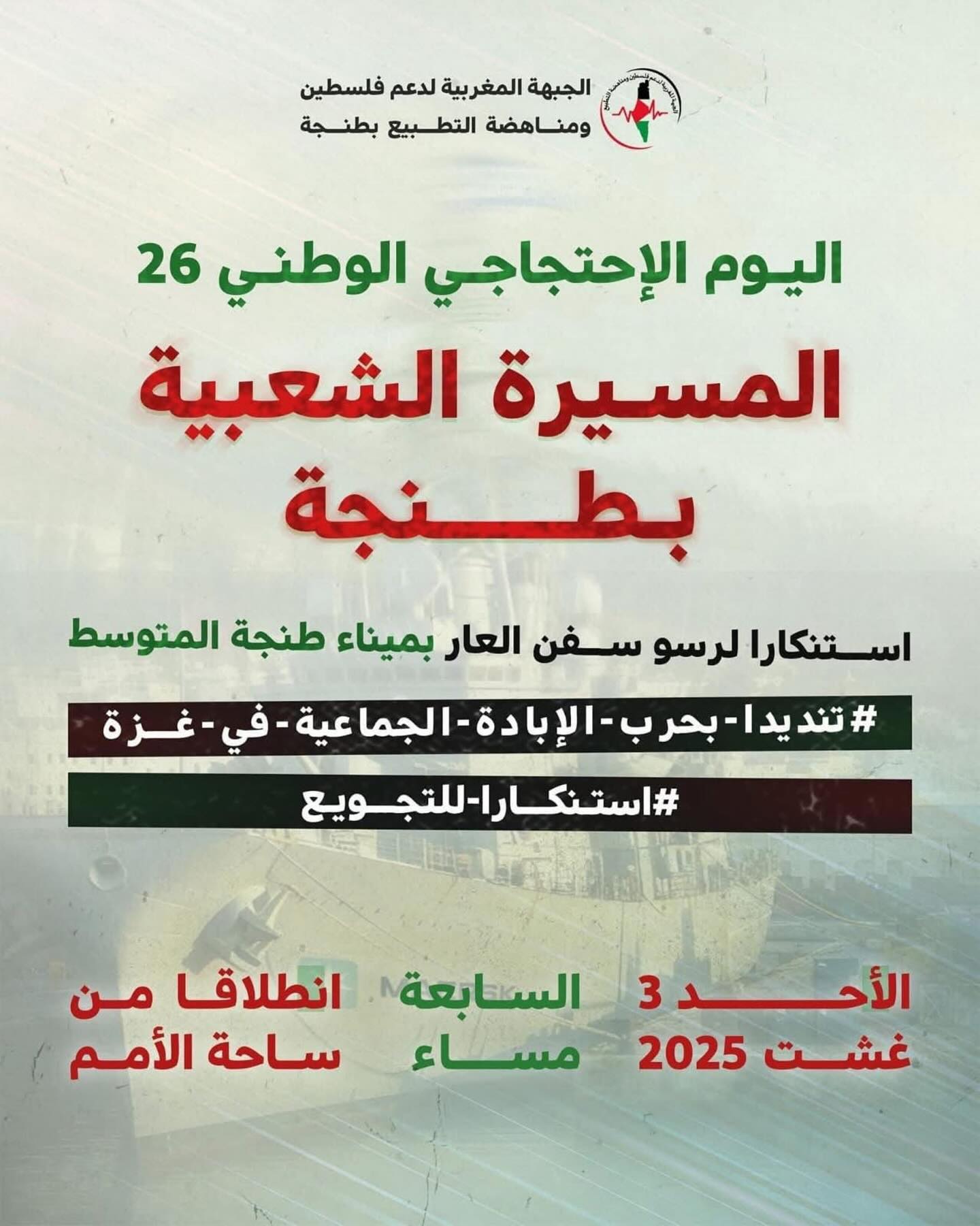وفي السياق ذاته، دعت حركة المقاطعة “بي دي أس”-المغرب سكان مدينة الدار البيضاء إلى المشاركة في الوقفة الاحتجاجية المقررة اليوم الاثنين أمام ميناء المدينة، بالتزامن مع تواجد سفينة “ميرسك نور فولك” المحملة بأسلحة موجهة للكيان الصهيوني.