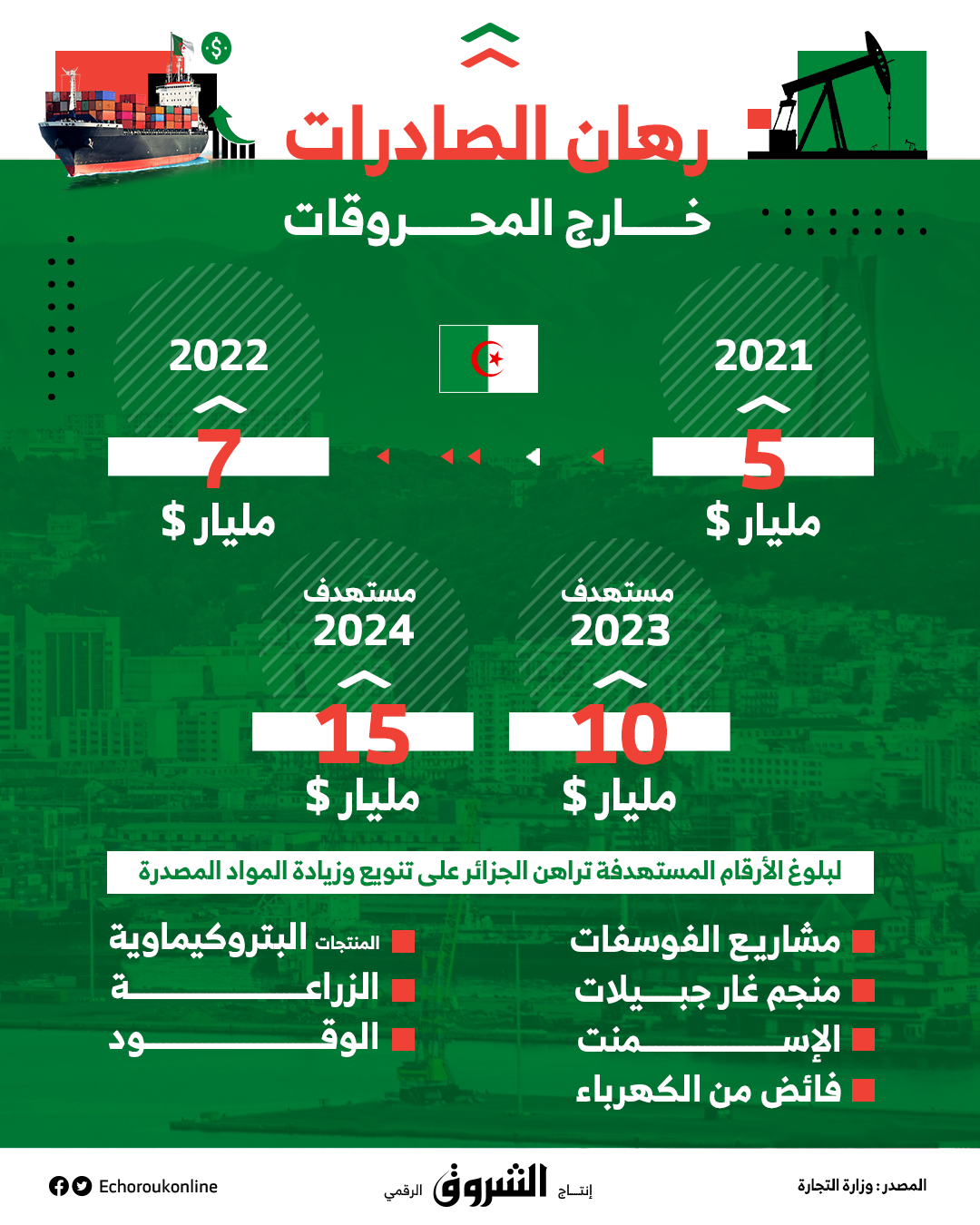 لبلوغ الأرقام المستهدفة تراهن الجزائر على تنويع وزيادة المواد المصدرة في مختلف القطاعات كالمنتجات الزراعية والمواد البتروكيماوية والكهرباء والإسمنت وغيرها.