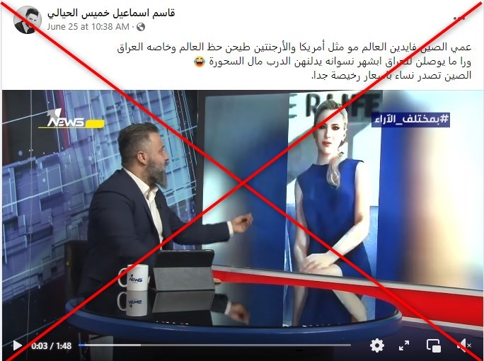 يبدو في الفيديو رجل يؤشر باتجاه شاشة تصوّر امرأة شقراء ويشرح بالقول إن “الصين أطلقت روبوتات على شكل سيدات، وعملوا على وضع ألياف فيها لتبدو على هيئة إنسان”.