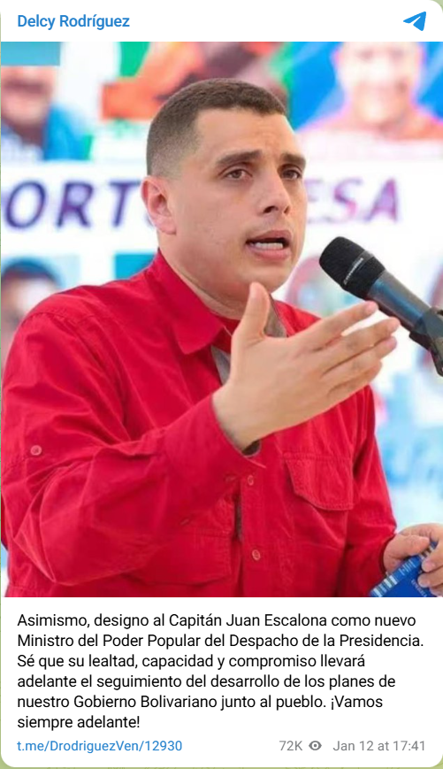 وأضافت في سياق حديثها عن إسكالونا، “أعلم أن ولاءه وكفاءته والتزامه سيضمن استمرار تطوير خطط حكومتنا البوليفارية بالتعاون مع الشعب”.