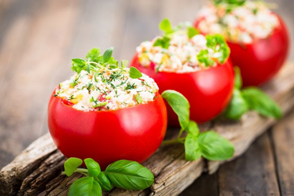 ـ املئي الطماطم بهذا الخليط وزينيها بما شئت (زيتون، ليمون، خيار) وقدميها وحدها أو في طبق مفروش بأوراق الخس.