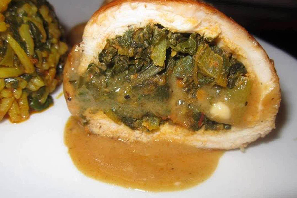 – ابسطي خليط الدجاج على ورق البلاستيك أضيفي له حشوة السلق ثم الجبن المبشور، ولفيه على شكل رولي.