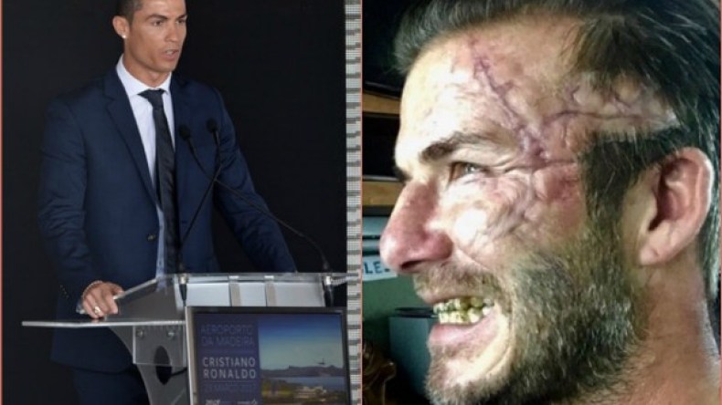 وبشأن النجم الكروي الإنجليزي السابق، فقد نشر ديفيد بيكهام (41 سنة) صورة عبر موقع التواصل الإجتماعي الإلكتروني “أنستغرام” (الصورة المُدرجة أعلاه، يمينا) تُظهره بِـ “وجه آخر”، تُميّزه ندبة في الجبهة (أعلى الوجه)، وكأنّه أجرى عملية جراحية بعد تعرّضه لِطعنة سيف أو خنجر، مع أسنان مُلوّثة لِرجل “شرّير” أو “متشرّد”!