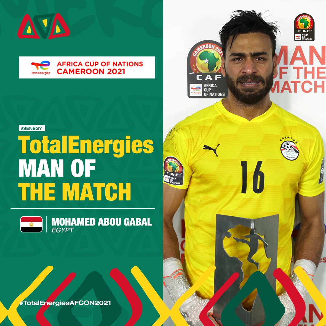 واستلم الحارس المصري محمد أبو جبل جائزة رجل مباراة نهائي “كان” 2022، عِلما أن حامي عرين نادي الزمالك خطف الأضواء، بِتدخّلاته المُوفّقة، وشجاعته في التلاحمات العنيفة، ومَنْحِهْ الثقة لِزملائه، وتصدّيه لِركلة جزاء نفّذها السنيغالي ساديو ماني، بعد 7 دقائق فقط من انطلاق المباراة النهائية. رغم أنه قدِم إلى الكاميرون بديلا لِزميله محمد الشناوي، الذي تعرّض لِإصابة في منتصف البطولة الإفريقية