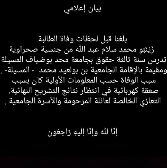 وقال الديوان في بيان نشره عبر حسابه الرسمي على فيسبوك: “بلغنا قبل لحظات وفاة الطالبة زينبو محمد سلام عبد الله من جنسية صحراوية تدرس سنة ثالثة حقوق بجامعة محمد بوضياف بالمسيلة”.